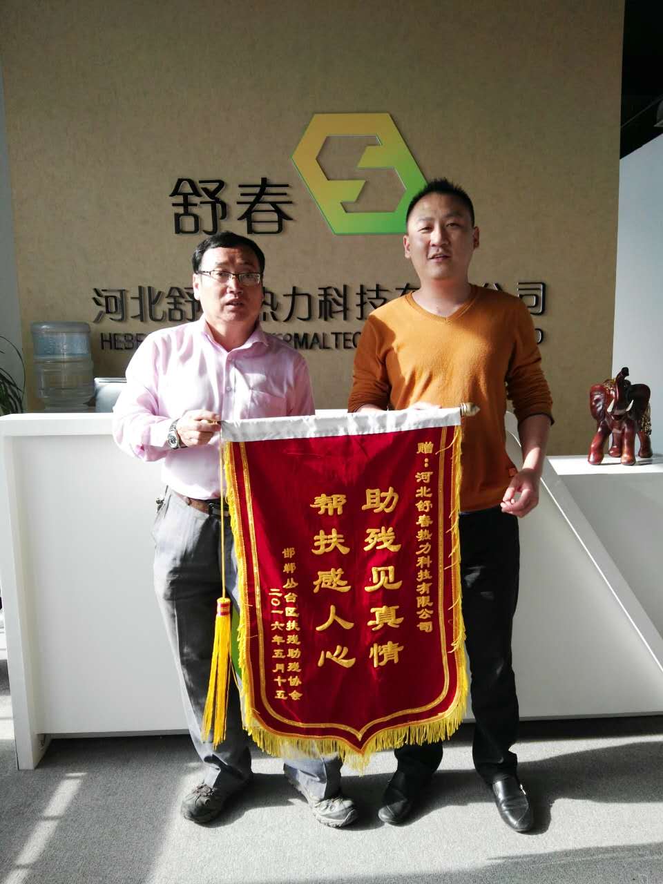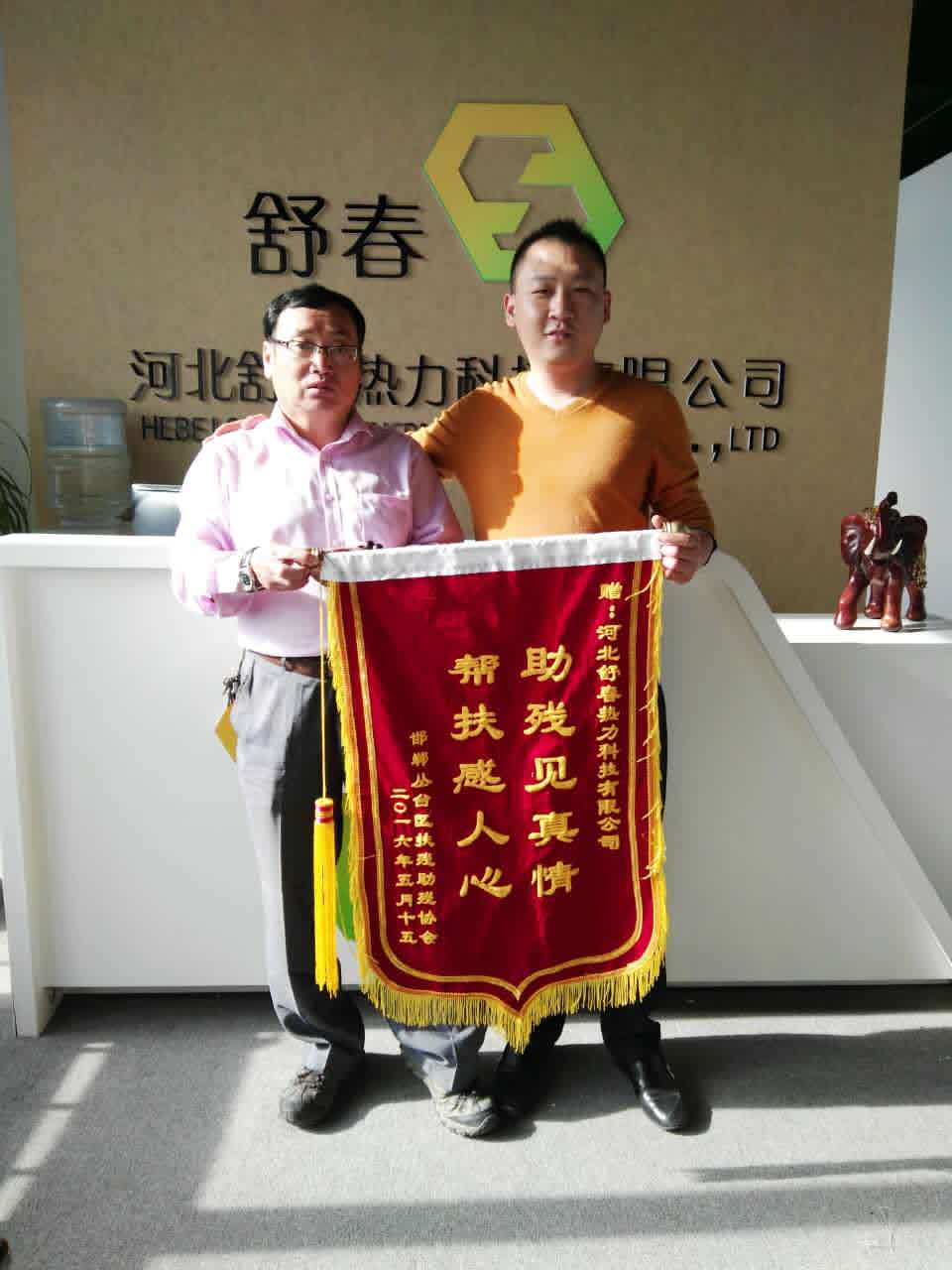 5月17日,邯鄲市殘聯(lián)肢殘人協(xié)會副主席、叢臺區(qū)殘聯(lián)肢殘人協(xié)會主席張鴻斌來到河北舒春熱力科技有限公司,親自送上錦旗,對河北舒春熱力科技公司的無償捐贈表示衷心的感謝。