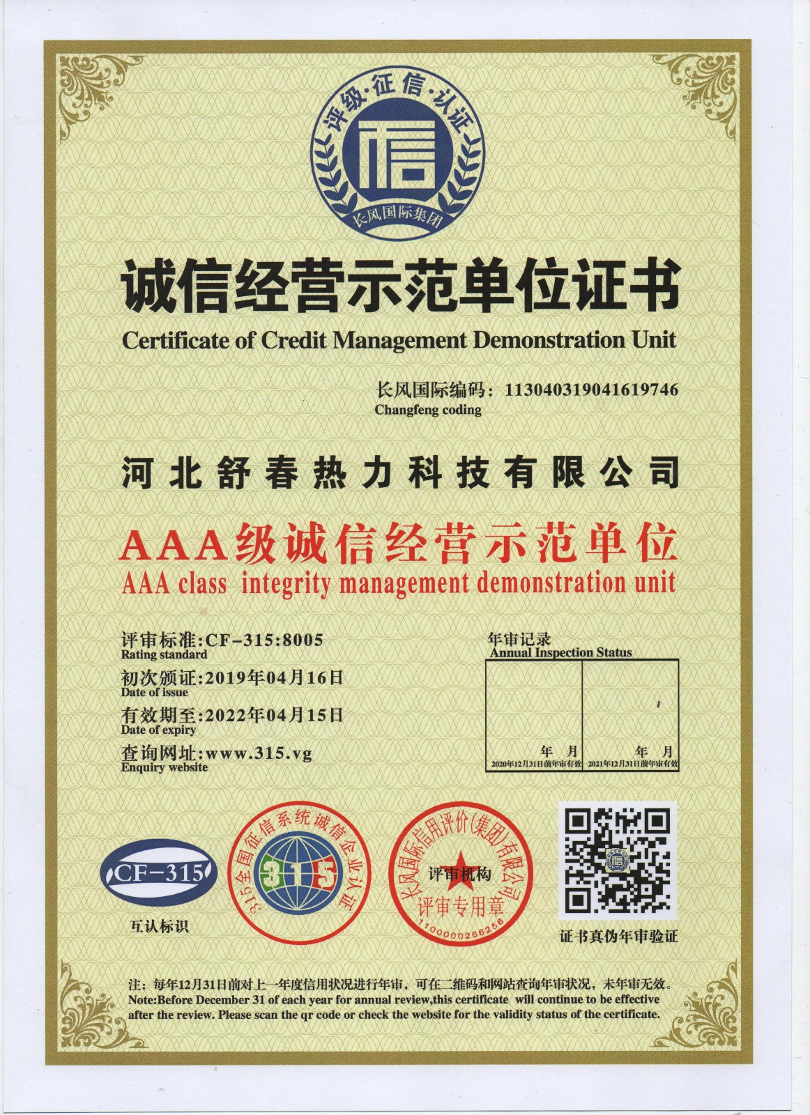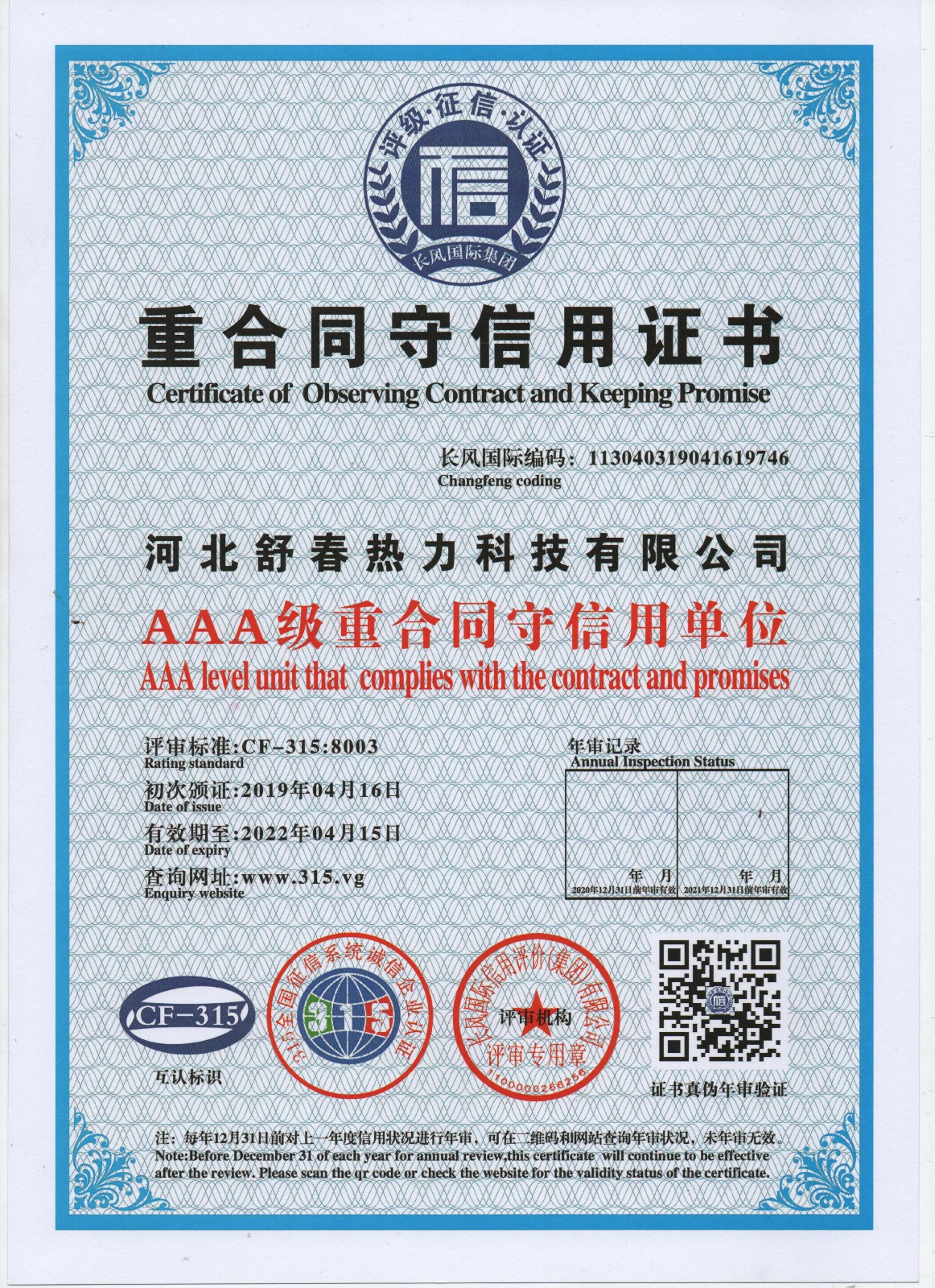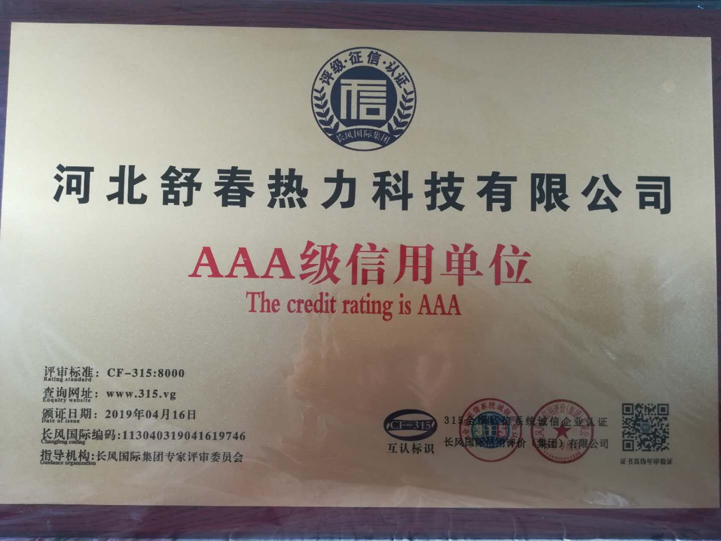 AAA級信用單位,舒春真誠對待每一個人 2019年4月16日,河北舒春熱力科技有限公司取得了AAA級信用單位、誠信經(jīng)理人、誠信企業(yè)家、AAA級質(zhì)量服務(wù)信譽(yù)單位、 AAA級重合同守信用單位、AAA級誠信經(jīng)營示范單位、AAA級資信等級、AAA級信用等級。