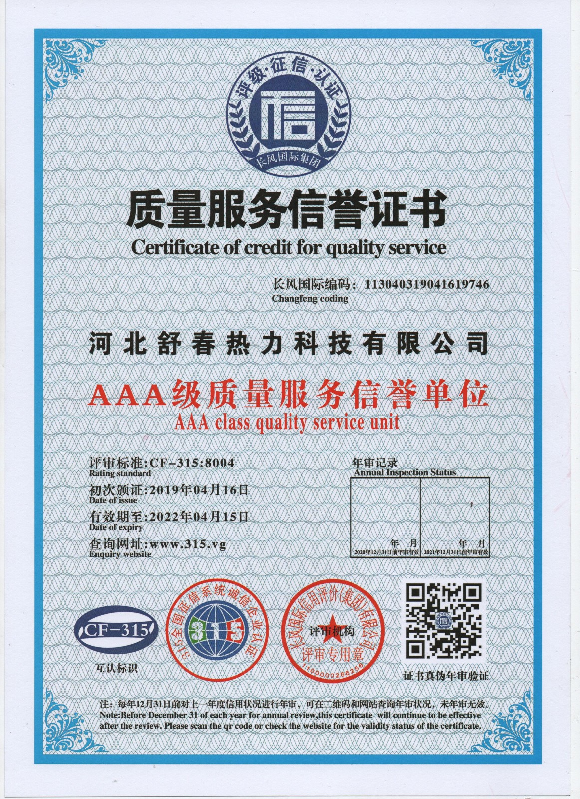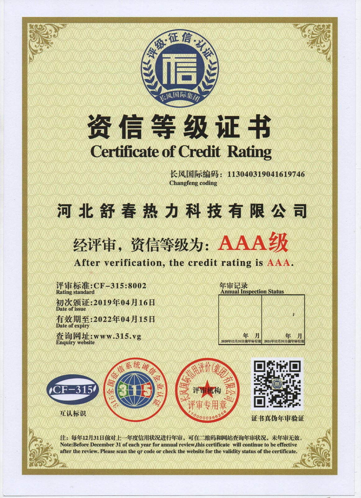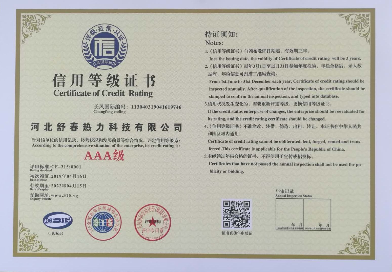 AAA級信用單位,舒春真誠對待每一個人 2019年4月16日,河北舒春熱力科技有限公司取得了AAA級信用單位、誠信經(jīng)理人、誠信企業(yè)家、AAA級質(zhì)量服務(wù)信譽(yù)單位、 AAA級重合同守信用單位、AAA級誠信經(jīng)營示范單位、AAA級資信等級、AAA級信用等級。